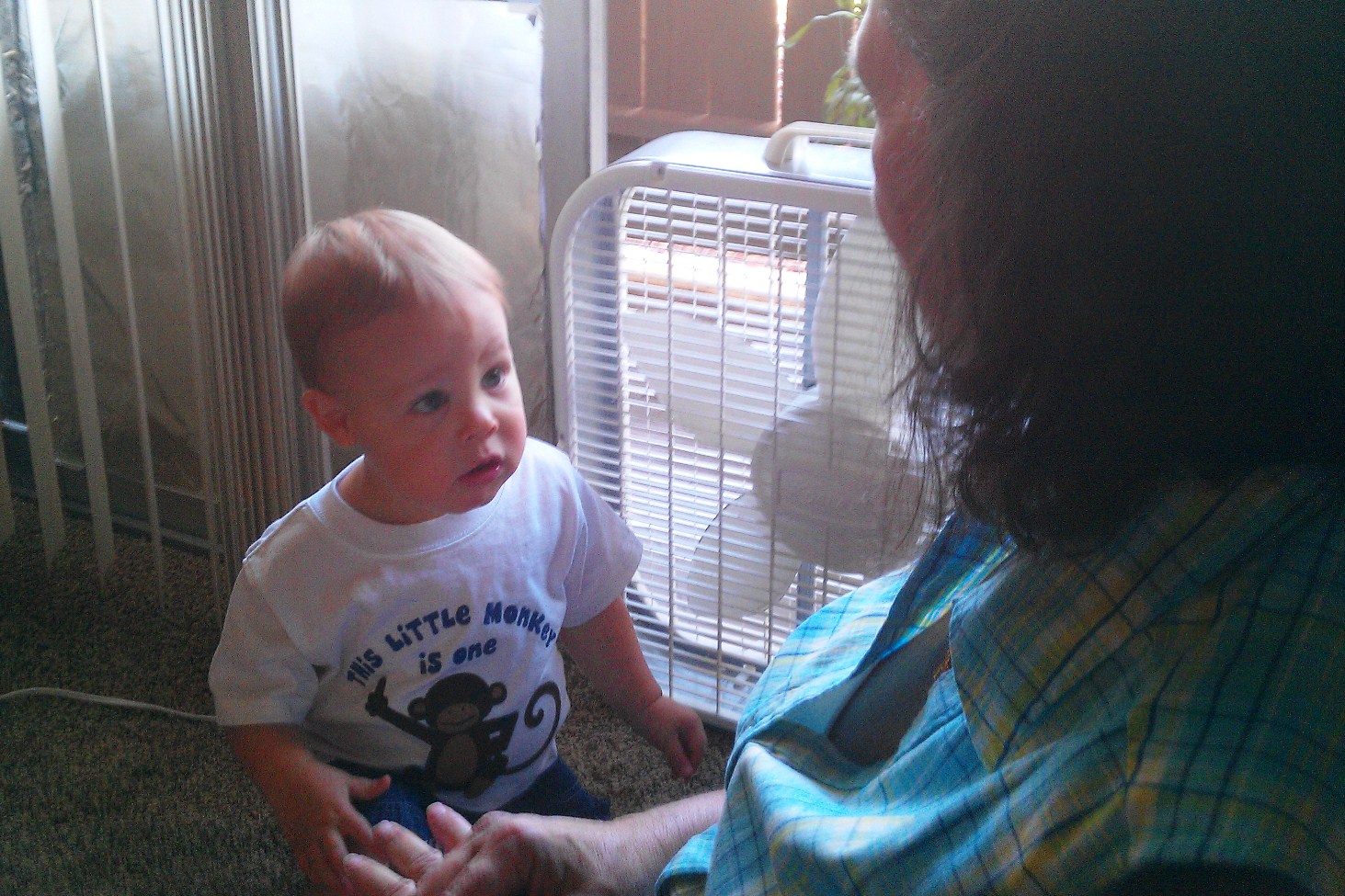 Proof that little kid fingers fit through the protective cover on fans! And that Brian has so many cute faces that I just can't come up with descriptions for!
